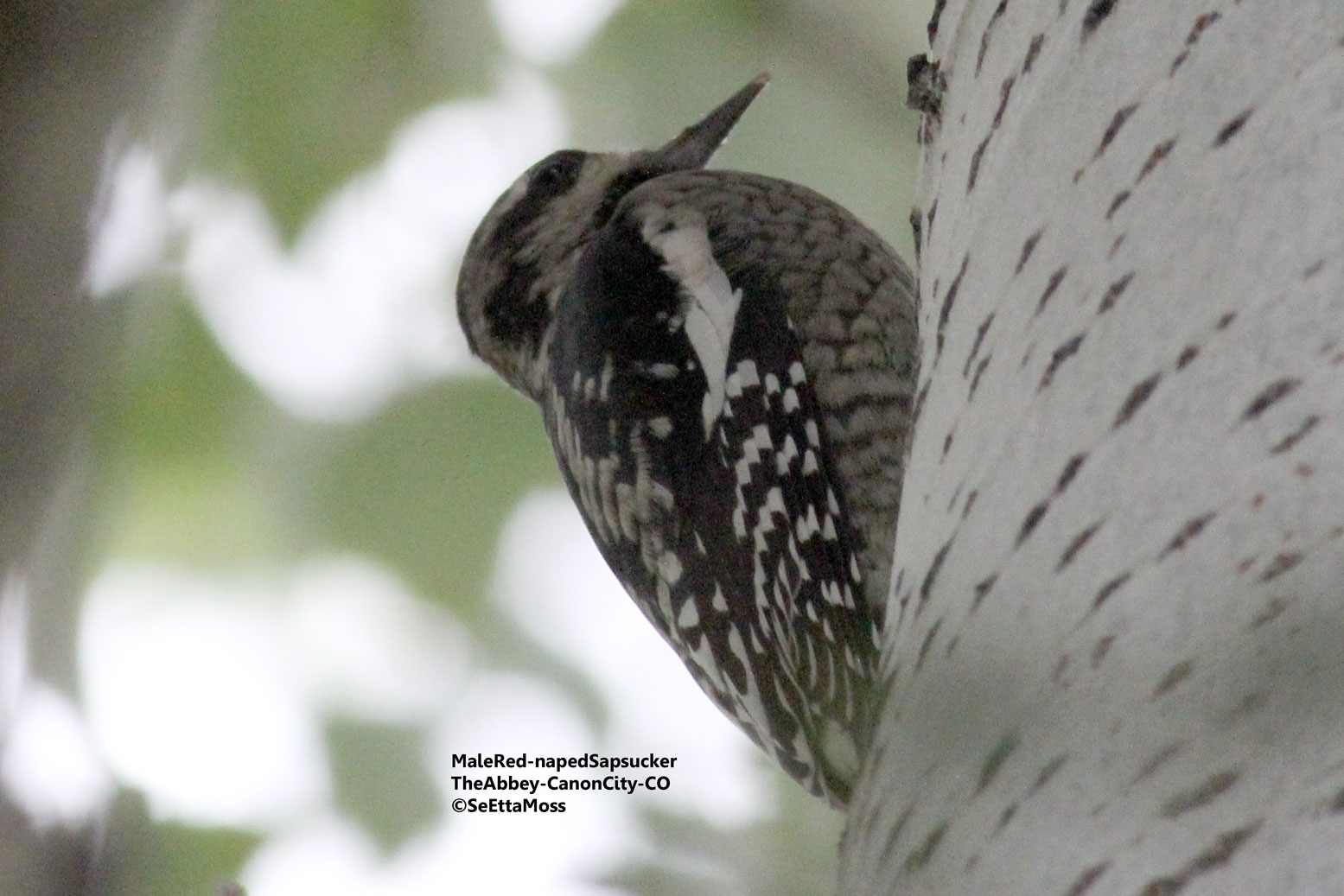 I spotted a Red-naped Sapsucker 4 days ago at the Abbey when it chased off a Williamson's that was feeding on one of their pine trees. I didn't get to see it well enough to tell it's gender but I photographed this Red-naped there today and it is a male. It was feeding on one of the diverse species of deciduous trees on the Abbey's grounds. Not sure if it is just stopping over to feed during migration or if it is an early 'wintering sapsucker' that stay in Canon City usually from Oct to late winter. SeEtta