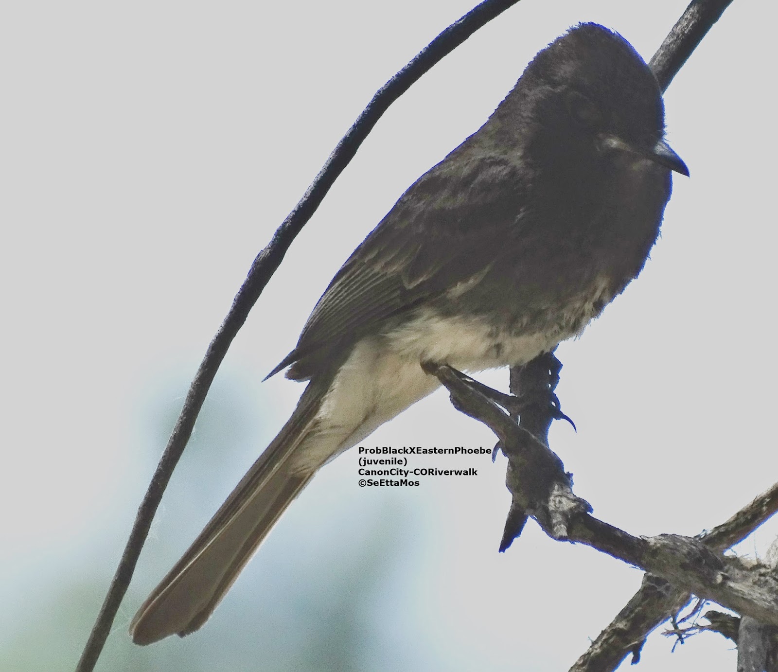 Found a probable hybrid Black X Eastern Phoebe juvenile on the Canon City Riverwalk