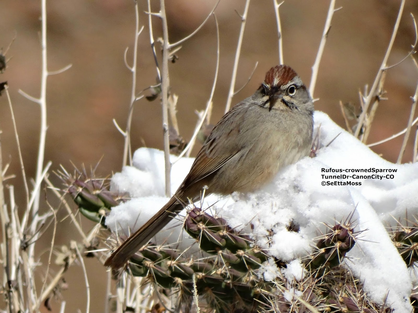Rufous-crowned Sparrows were first discovered about 15 years ago at the Tunnel Drive area of Canon City during a Christmas Bird Count by birder Dave Johnson. They have been seen in this area every year (rarely seen during June and July when I speculate they go up into the higher side canyons in this area for nesting) and are the most northern residents of this species in Colorado.