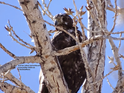 I spotted this very shy Harlan's Red-tailed Hawk as I was driving early this week. It was in the back of a large tree and partially obscured by the branches and the location was difficult to find a place to pull off the road safely so these were the only photos I got. Though I stayed in my car and was about 150 feet away this bird flushed and flew into a tree deep into private property where I could just barely see it. SeEtta